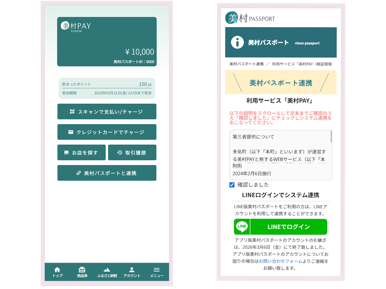 美村PAYのホームにある「美村パスポートと連携」を押し、LINEのアカウントでログインすれば完了です。